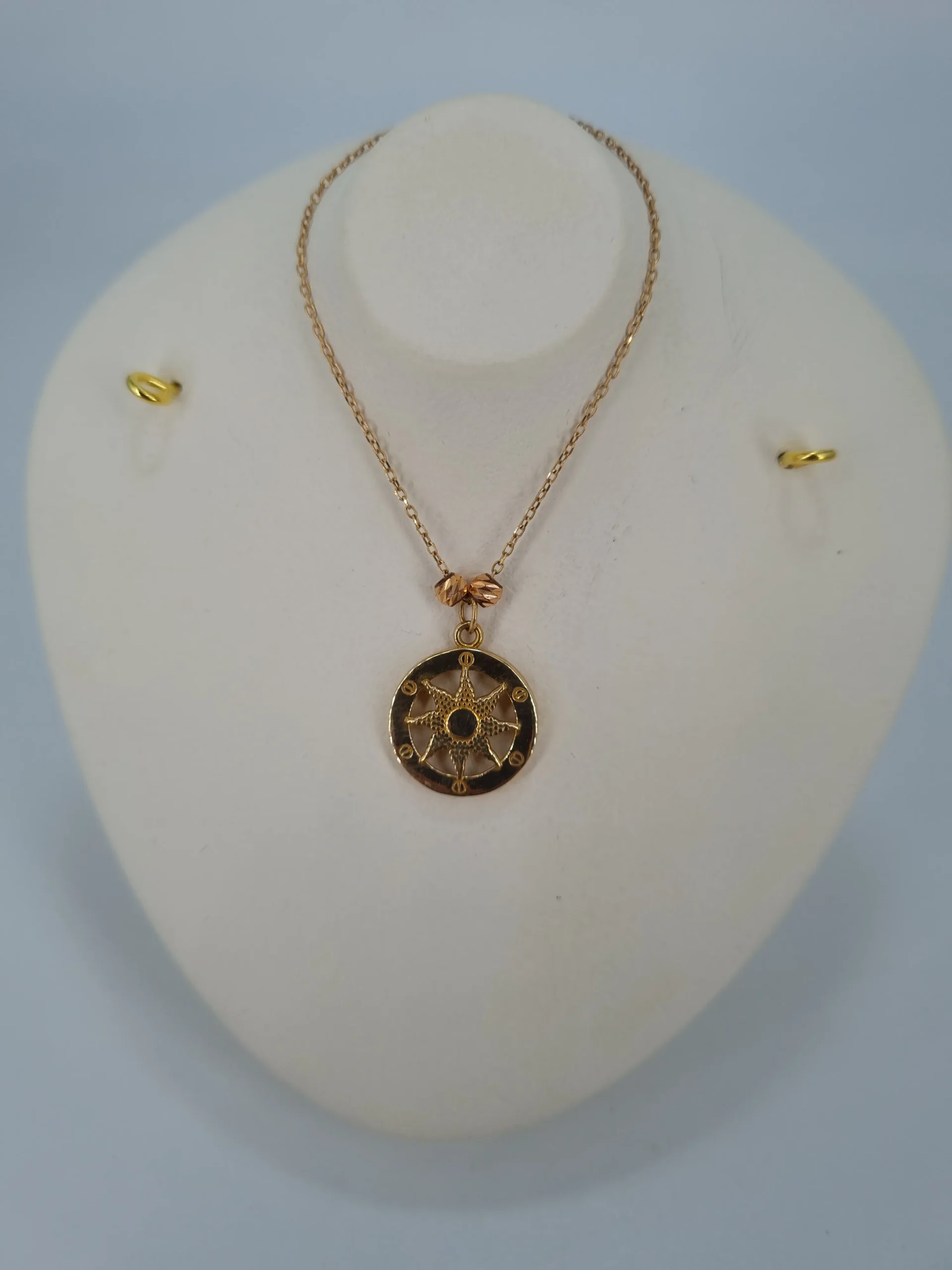 گردنبند طلای طرح خورشید با وزن ۲.۷ گرم، نمادی از انرژی، روشنایی و زیبایی است که استایل شما را به شکلی درخشان تکمیل میکند. این گردنبند با طراحی ظریف و الهامگرفته از شکل خورشید، جلوهای مدرن و در عین حال کلاسیک دارد و مناسب استفاده روزمره و مراسمهای خاص است.